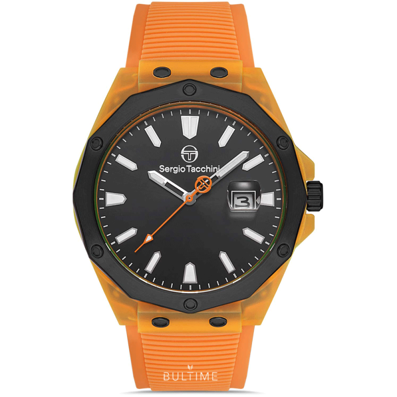 Мъжки часовник Sergio Tacchini със спортно-ежедневен дизайн от колекцията Streamline. Моделът е с черен аналогов дисплей с показател за дата. Стъкло минерал-кристал. Корпус от полимер. Оранжева силиконова каишка. Кварцов механизъм. Водоустойчивост 5 ATM - допускат се леки пръски и взимане на душ, не се препоръчва обилно мокрене.