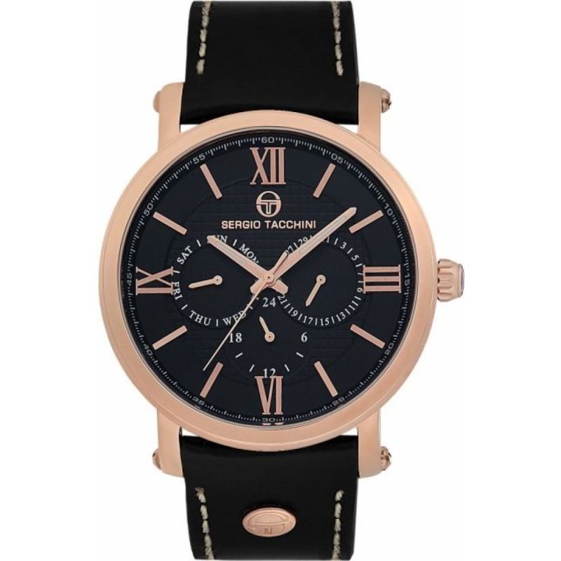 Мъжки часовник Sergio Tacchini с мултифункционален дисплей от колекцията City. Корпус от неръждаема стомана, съчетан с кожена каишка. Минерално стъкло, устойчиво на надраскване. Задвижва се от кварцов механизъм. Водоустойчивост 5 ATM - допускат се леки пръски и взимане на душ, не се препоръчва обилно мокрене.