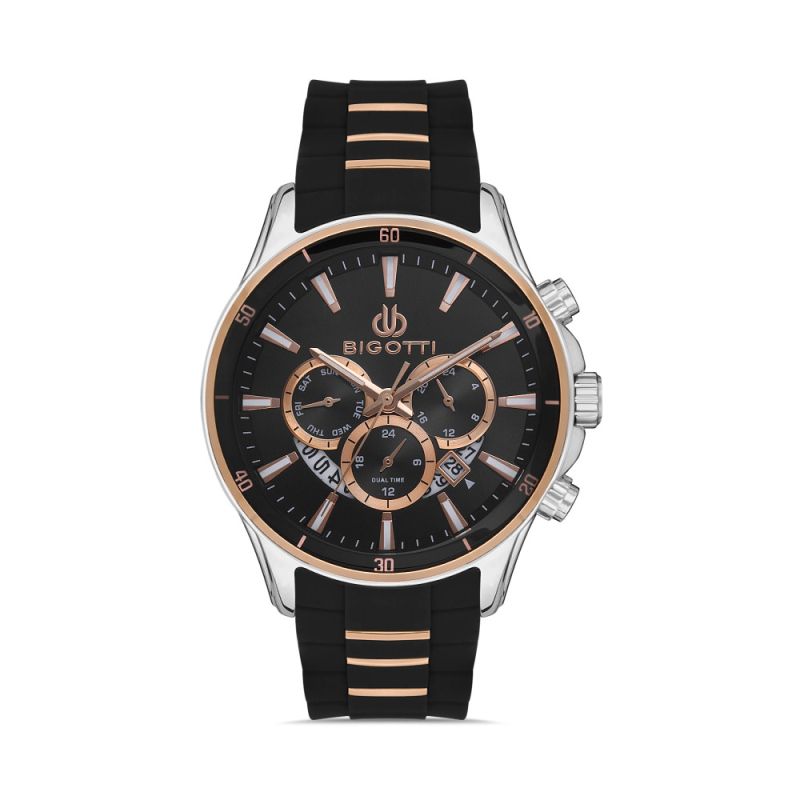 Мъжки часовник Bigotti със спортно-елегантен дизайн от колекцията Milano. Метален корпус в комбинация със силиконова каишка. Черен мултифункционален дисплей в детайли в цвят розово злато. Луминисцентно покритие на стрелките и индексите. Минерално стъкло, устойчиво на надраскване. Задвижва се от кварцов механизъм. Водоустойчивост 5 ATM - допускат се леки пръски и взимане на душ, не се препоръчва обилно мокрене.