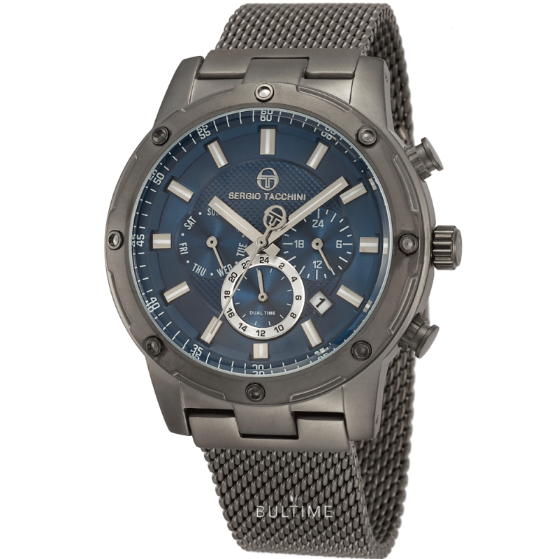 Мъжки часовник Sergio Tacchini от колекцията Archivio. Моделът е с корпус и верижка от неръждаема стомана. Син мултифункционален дисплей с показатели за дата, ден и двойно време. Стъкло минерал-кристал. Задвижва се от кварцов механизъм. Водоустойчивост 5 ATM - допускат се леки пръски и взимане на душ, не се препоръчва обилно мокрене.
