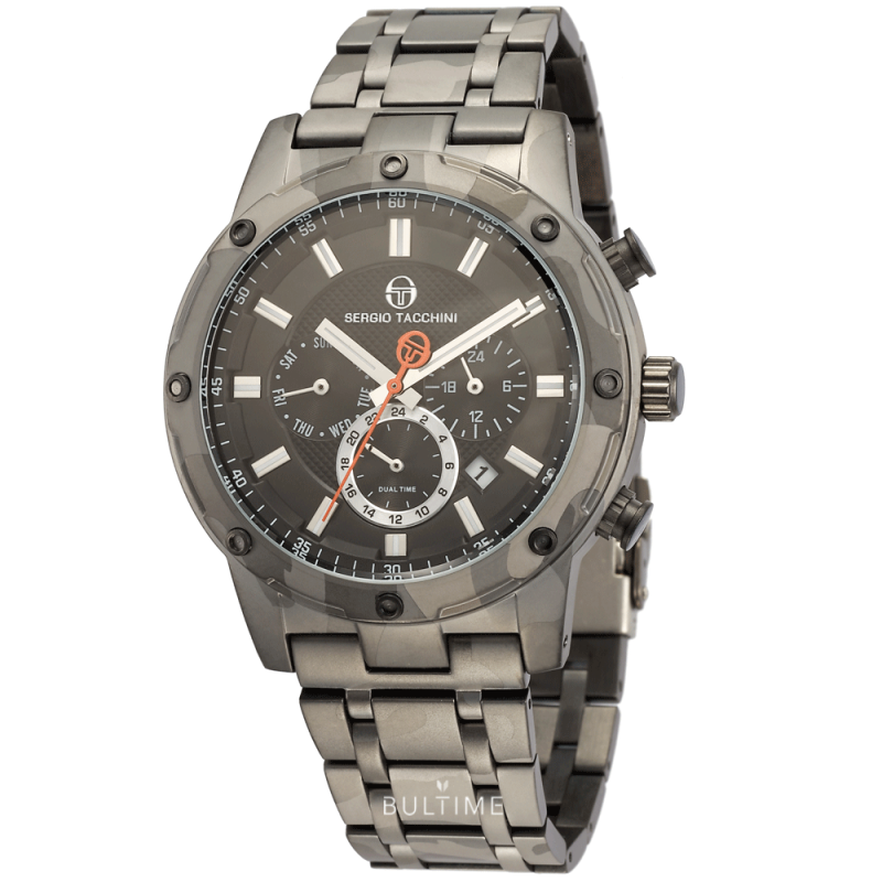 Мъжки часовник Sergio Tacchini от колекцията Archivio. Корпус и верижка с камуфлажна шарка от неръждема стомана . Сив мултифункционален дисплей с показатели за дата, ден и двойно време. Стъкло минерал-кристал. Задвижва се от кварцов механизъм. Водоустойчивост 5 ATM - допускат се леки пръски и взимане на душ, не се препоръчва обилно мокрене.
