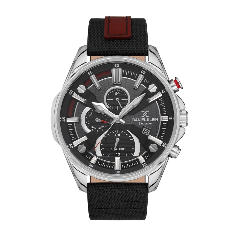 Мъжки часовник Daniel Klein със спортно-елегантен дизайн от колекцията Exclusive. Моделът е с каишка в комбинация от кожа и текстил. Корпусът е изработен от метал. Дисплеят е мултифункционален с луминисцентно покритие на стрелките и индексите. Стъклото е минерал-кристал. Задвижва се от кварцов механизъм. Водоустойчивост 5 ATM - допускат се леки пръски и взимане на душ, не се препоръчва обилно мокрене.