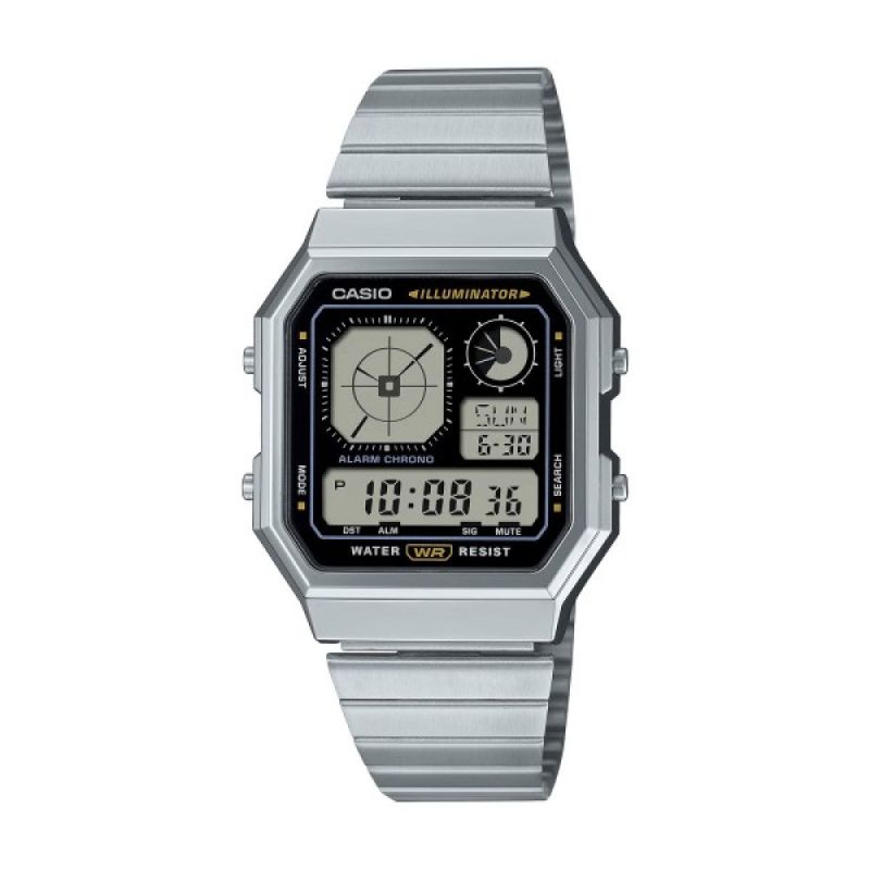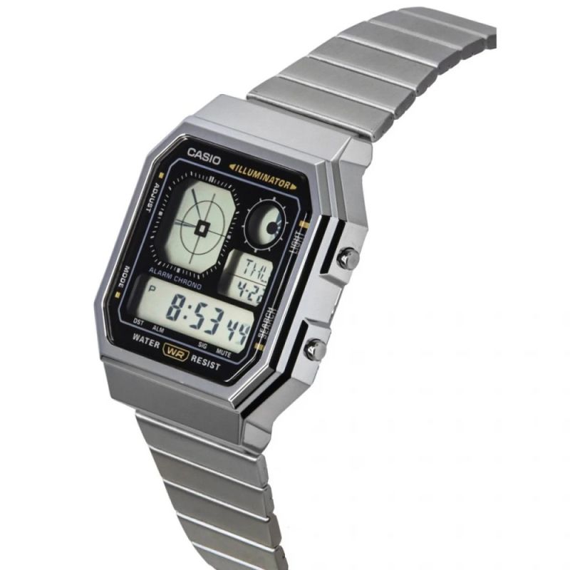 Мъжки часовник Casio с ретро дизайн. Моделът е с корпус от полимер и верижка от неръждаема стомана. Дигитален дисплей. Часовникът е със следните функции: световно време, автоматичен календар, хронометър, обратно броене, 12/24-часов формат, 5 независими дневни аларми, сигнализация на кръгъл час ON/OFF, led осветяване на дисплея. Стъкло от плексиглас. Задвижва се от кварцов механизъм с батерия CR1616. Водоустойчивост 3 ATM - допускат се леки пръски, не се препоръчва обилно мокрене.