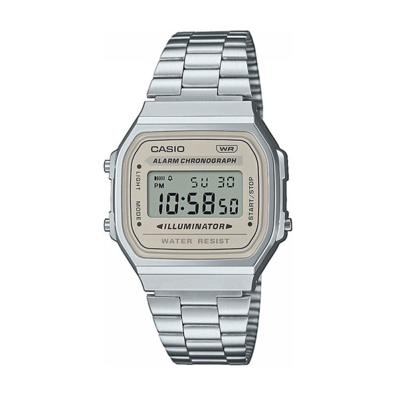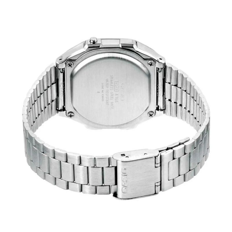 Унисекс часовник Casio с корпус от полимер и сребриста верижка от неръждаема стомана. Моделът е с дигитален дисплей и минерално стъкло. Часовникът е със следните функции: автоматичен календар, хронометър, 12/24 часов формат, дневна аларма, led осветяване на дисплея. Задвижва се от кварцов механизъм с батерия CR2016. Водоустойчивост 3 ATM - допускат се леки пръски, не се препоръчва обилно мокрене