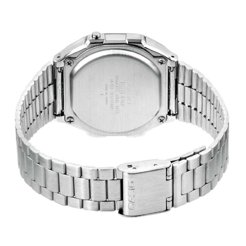 Класически модел мъжки часовник Casio. Корпус от полимер. Сребриста верижка от неръждаема стомана. Сив правоъгълен дисплей. Кварцов механизъм. Моделът има следните функции: автоматичен календар, 12/24 часов формат, дневна аларма, хронометър, microlight осветяване на дисплея. Задвижва се от кварцов механизъм с батерия CR2016. Водоустойчивост 3 ATM - допускат се леки пръски, не се препоръчва обилно мокрене.