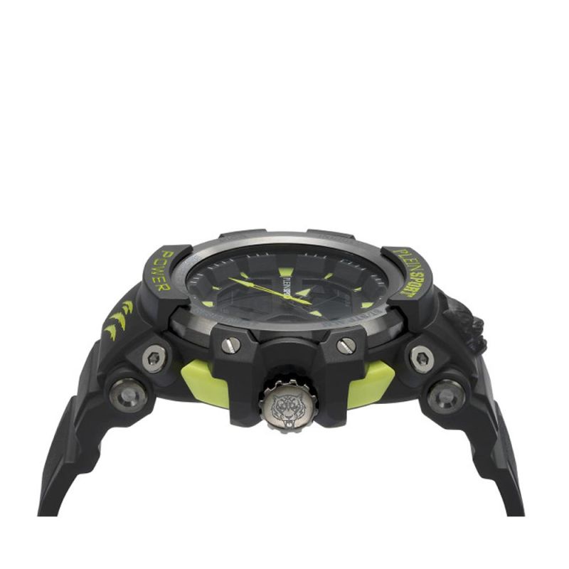 Спортен мъжки часовник Philipp Plein от колекцията Plein Sport. Дисплей комбинация от аналогов и дигитален. Луминисцентно покритие на стрелките и индексите. Минерално стъкло, устойчиво към надраскване. Пластмасов корпус, съчетан със силиконова каишка. Моделът има следните функции: 24-часов формат, аларма, хронометър и календар. Кварцов механизъм. Водоустойчивост 5 ATM - допускат се леки пръски и взимане на душ, не се препоръчва обилно мокрене.