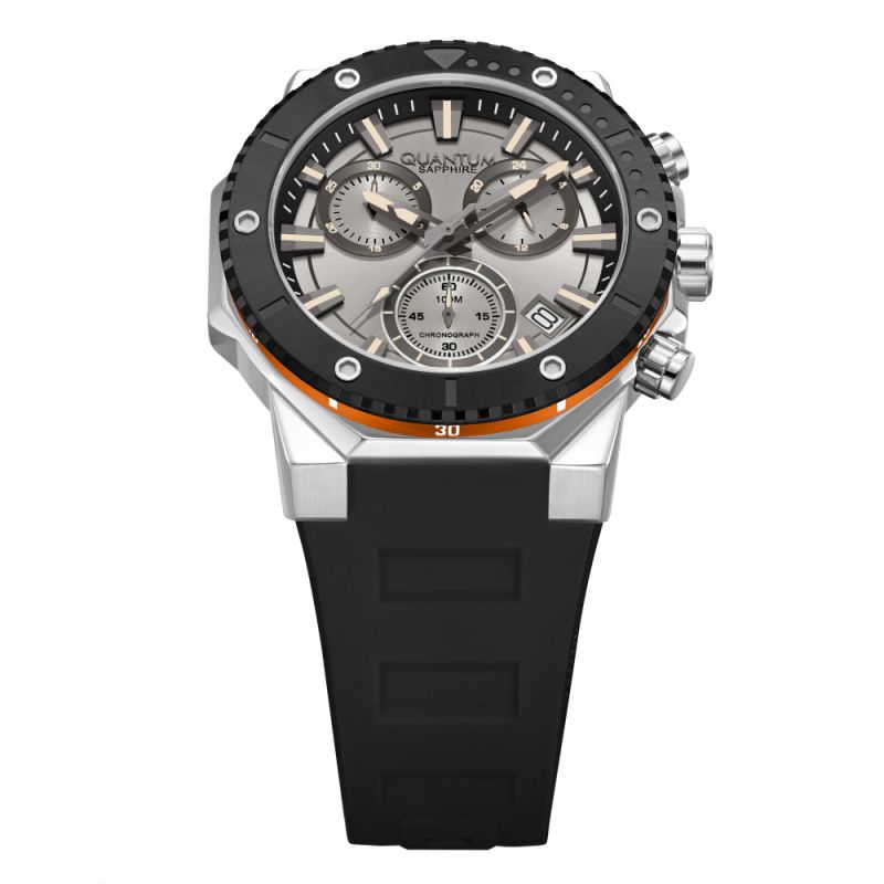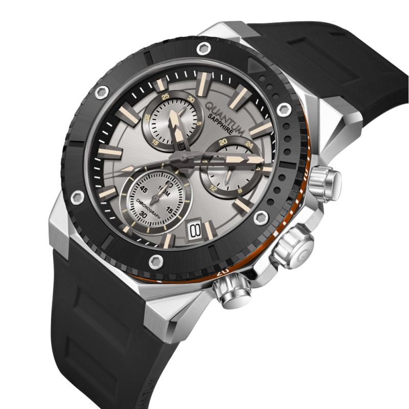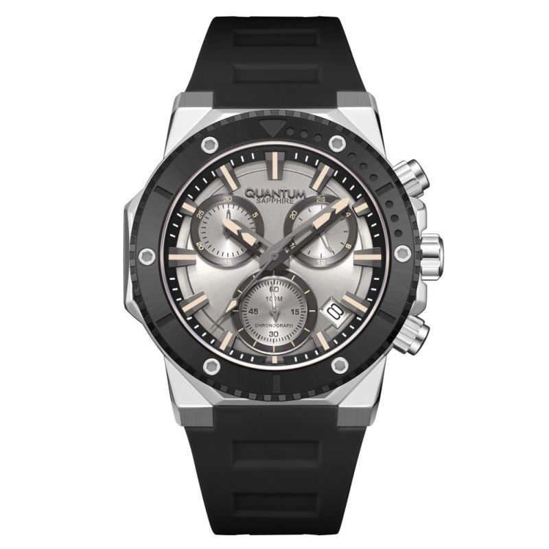 Мъжки часовник Quantum с модерен спортно-елегантен дизайн от колекцията Hunter. Дисплей тип хронограф в сребрист цвят. Стъкло сапфир-кристал. Сребрист кръгъл корпус изработен от неръждаема стомана. Черна силиконова каишка. Задвижва се от кварцов механизъм. Диаметър на корпуса 44 мм. Водоустойчивост 10 ATM - позволява мокрене, къпане и плуване във водни басейни.