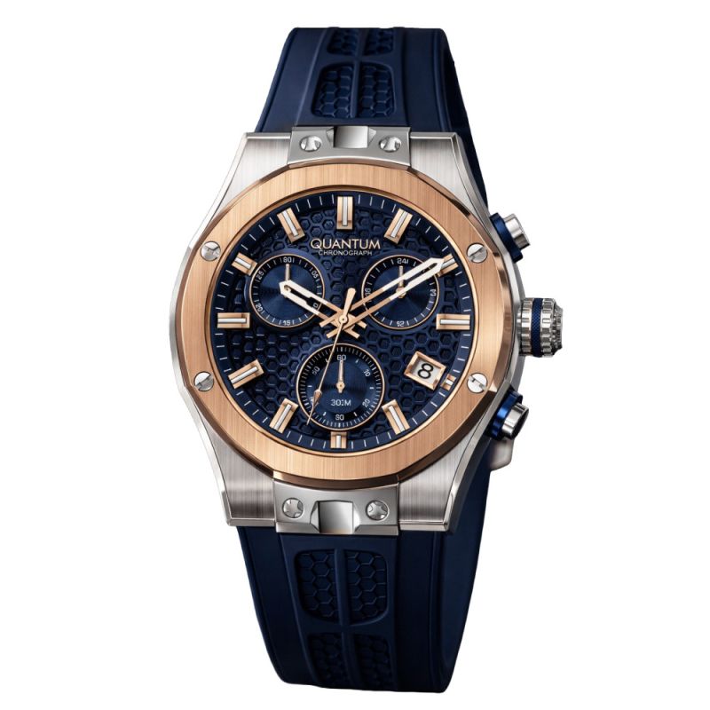 Спортен модел мъжки часовник Quantum от колекцията Hunter. Часовникът е с дисплей тип хронограф и стъкло сапфир-кристал. Корпус от неръждаема стомана в комбинация със силиконова каишка. Задвижва се от кварцов механизъм. Диаметър на корпуса 44 мм. Водоустойчивост 10 ATM - позволява мокрене, къпане и плуване във водни басейни.