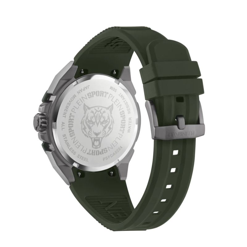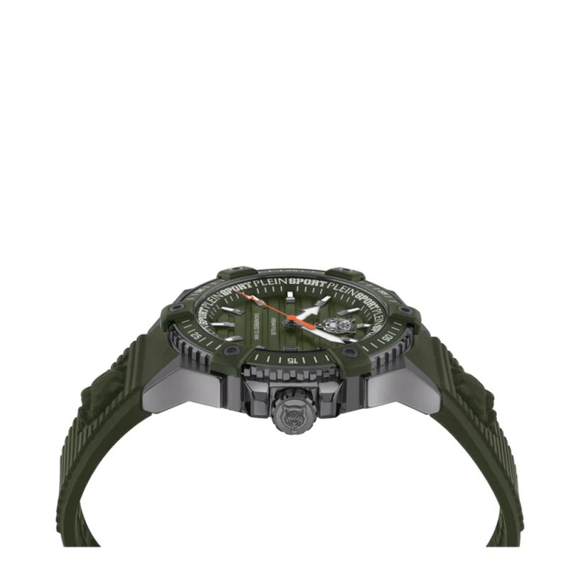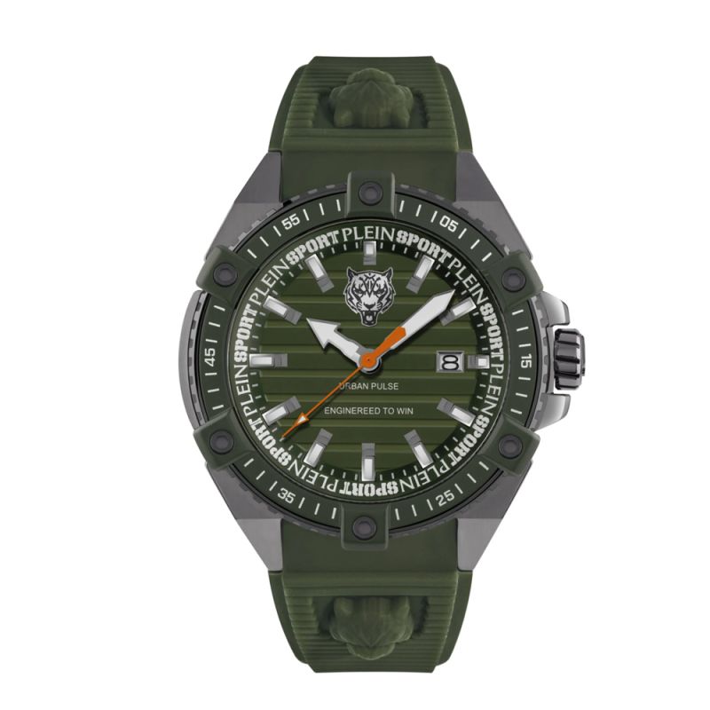 Мъжки часовник Philipp Plein с модерен спортен дизайн. Тъмнозелен аналогов дисплей с надпис „Engineered to Win“ и показател за дата. Луминесцентно покрите върху стрилките и индексите. Стъкло минерал-кристал. Корпус изработен от неръждаема стомана. Силиконова каишка с 3D тигрова глава. Диаметър на корпуса 47 мм. Задвижва се от кварцов механизъм. Водоустойчивост 5 ATM - допускат се леки пръски и взимане на душ, не се препоръчва обилно мокрене.