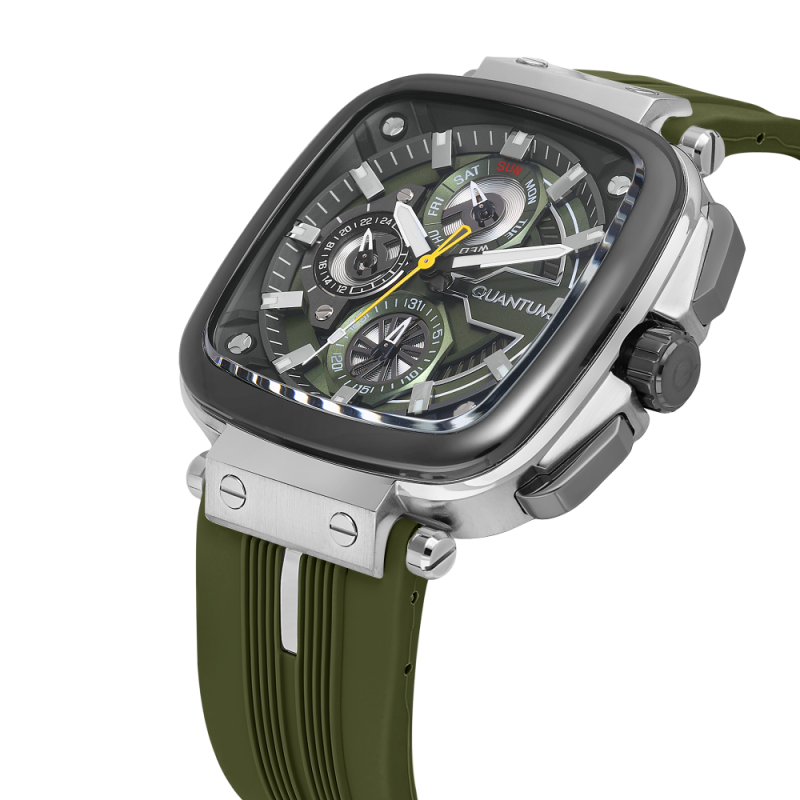 Мъжки часовник Quantum с впечатляващ дизайн. Моделът е с мултифункционален дисплей. Луминесцентно покритие върху стрелките и индексите. Стъкло минерал-кристал с антирефлексно покритие. Корпус от неръждаема стомана в комбинация със силиконова каишка. Задвижва се от кварцов механизъм. Водоустойчивост 10 ATM - позволява мокрене, къпане и плуване във водни басейни.