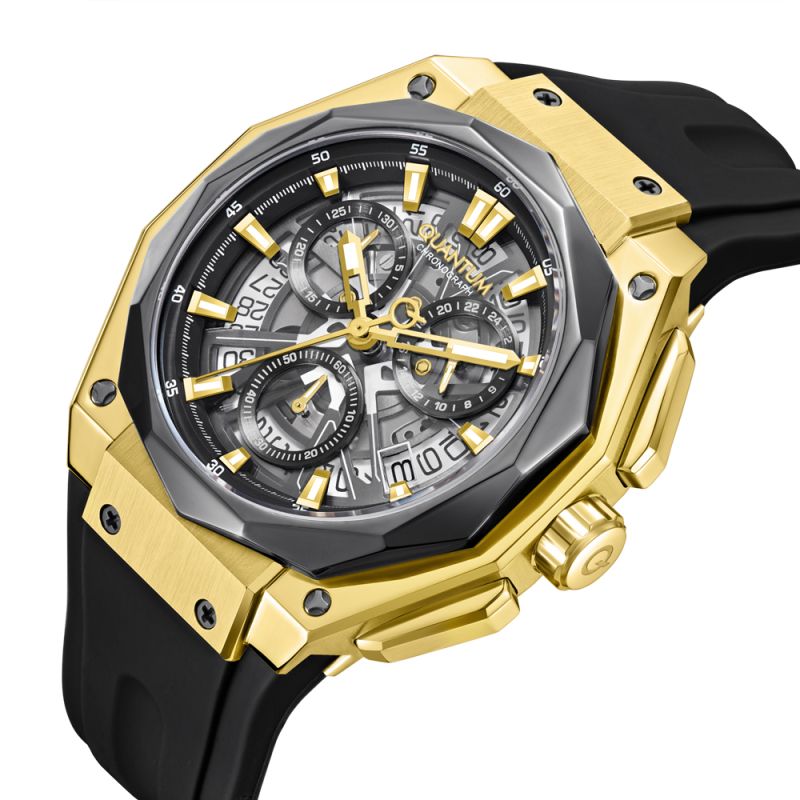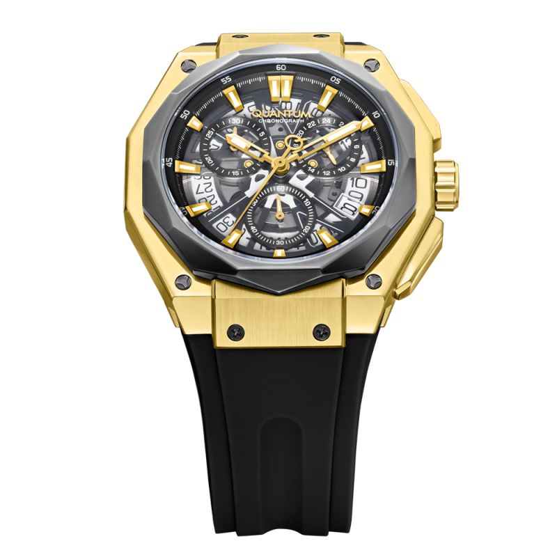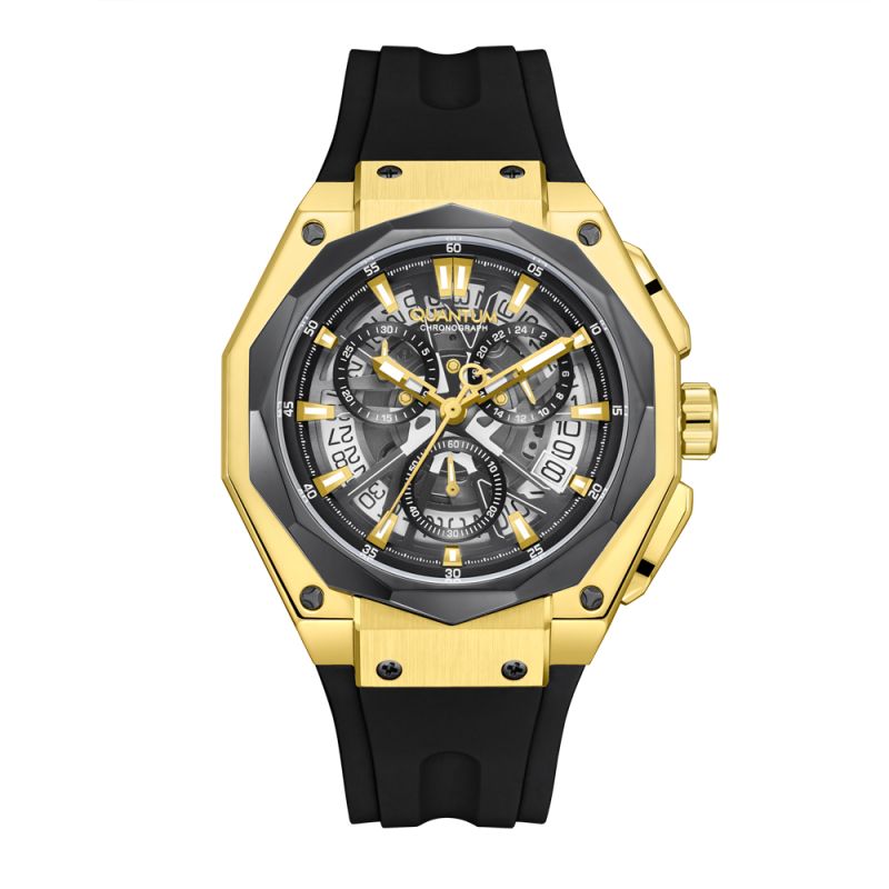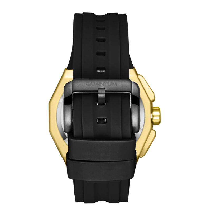 Спортен модел мъжки часовник Quantum от колекцията Hunter. Диисплей тип хронограф в черен цвят със златисти детайли. Луминесцентно покритие върху стрелките и индексите. Стъкло минерал-кристал. Корпус от неръждаема стомана в комбинация със силиконова каишка. Задвижва се от кварцов механизъм. Диаметър на корпуса 47 мм. Водоустойчивост 10 ATM - позволява мокрене, къпане и плуване във водни басейни.