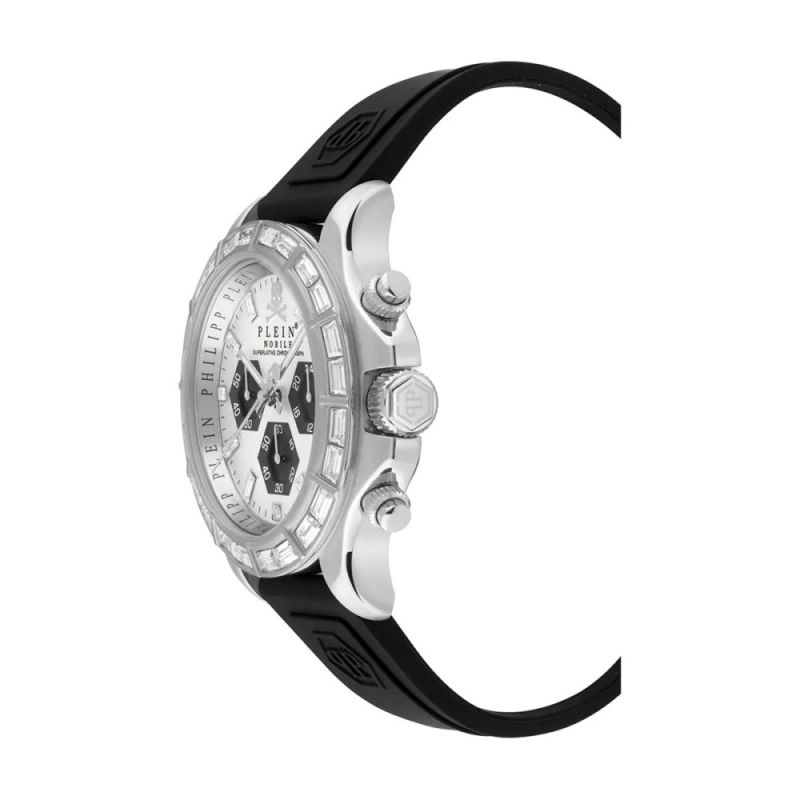 Мъжки часовник Philipp Plein от колекция Nobile. Моделът е със стилен дисплей хронограф и декорация от кристали. Корпус изработен от неръждаема стомана. Черна силиконова каишка. Стъкло минерал-кристал. Часовникът се задвижва от кварцов механизъм. Водоустойчивост 5 ATM - допускат се леки пръски и взимане на душ, не се препоръчва обилно мокрене.
