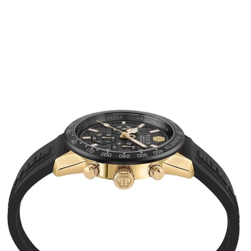 Мъжки часовник Philipp Plein с корпус от неръждаема стомана. Черна силиконова каишка. Стилен дисплей тип хронограф в черен цвят. Луминесцентно покрите върху стрилките и индексите. Стъкло минерал-кристал. Часовникът се задвижва от кварцов механизъм. Водоустойчивост 5 ATM - допускат се леки пръски и взимане на душ, не се препоръчва обилно мокрене.