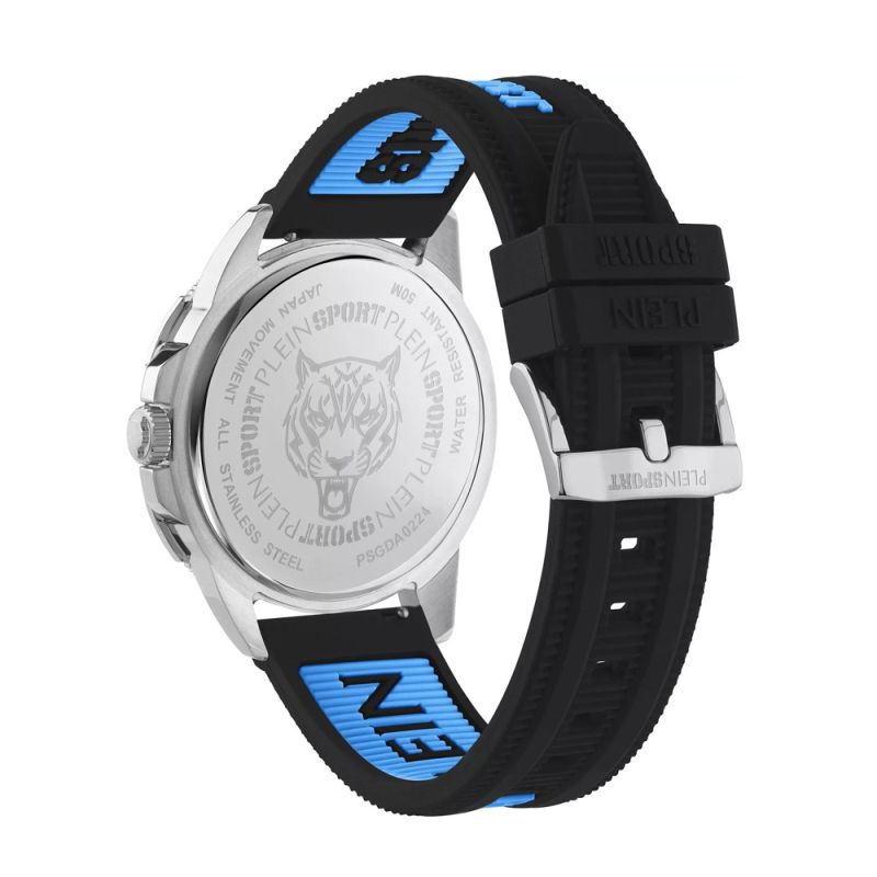Спортен модел мъжки часовник Philipp Plein. Корпус от неръждаема стомана в комбинация със силиконова каишка. Диаметър на корпуса 44 мм. Черен аналогов дисплей с детайли в син цвят и с показател за дата. Стъкло минерал-кристал. Часовникът се задвижва от кварцов механизъм. Водоустойчивост 5 ATM - допускат се леки пръски и взимане на душ, не се препоръчва обилно мокрене.