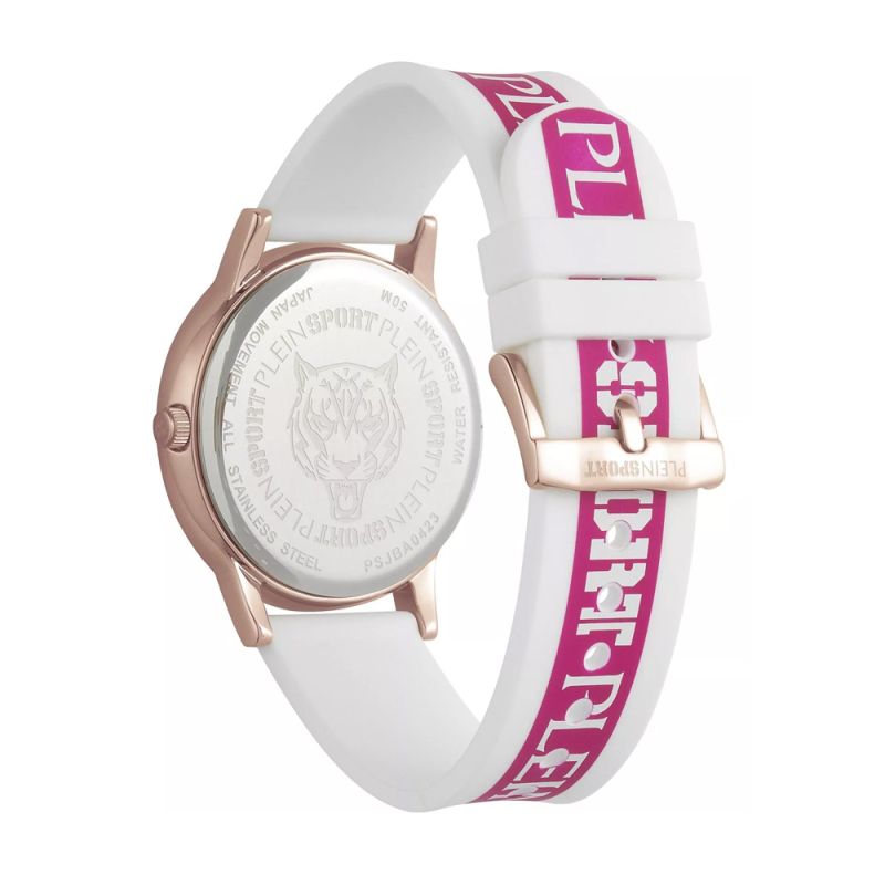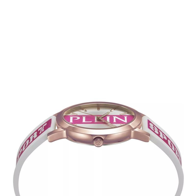 Дамски часовник Philipp Plein със спортно-елегантне дизайн. Корпусът е изработен от неръждаема стомана. Диаметър на корпуса 41 мм. Луминесцентно покритие върху стрелките. Силиконовата каишка и циферблатът са в красива комбинация между бял и розов цвят с логото на колекцията. Стъкло минерал-кристал. Часовникът се задвижва от кварцов механизъм.  Водоустойчивост 5 ATM - допускат се леки пръски и взимане на душ, не се препоръчва обилно мокрене.