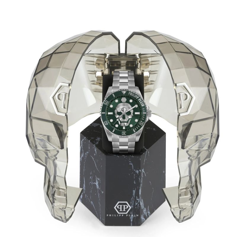 Мъжки часовник Philipp Plein с впечатляващ дизайн от колекция The $kull Diver. Зелен циферблат с централно разположен череп. Минерално стъкло, устойчиво към надраскване. Корпус и верижка от неръждаема стомана. Кварцов механизъм. Водоустойчивост 10 ATM - позволява мокрене, къпане и плуване във водни басейни.