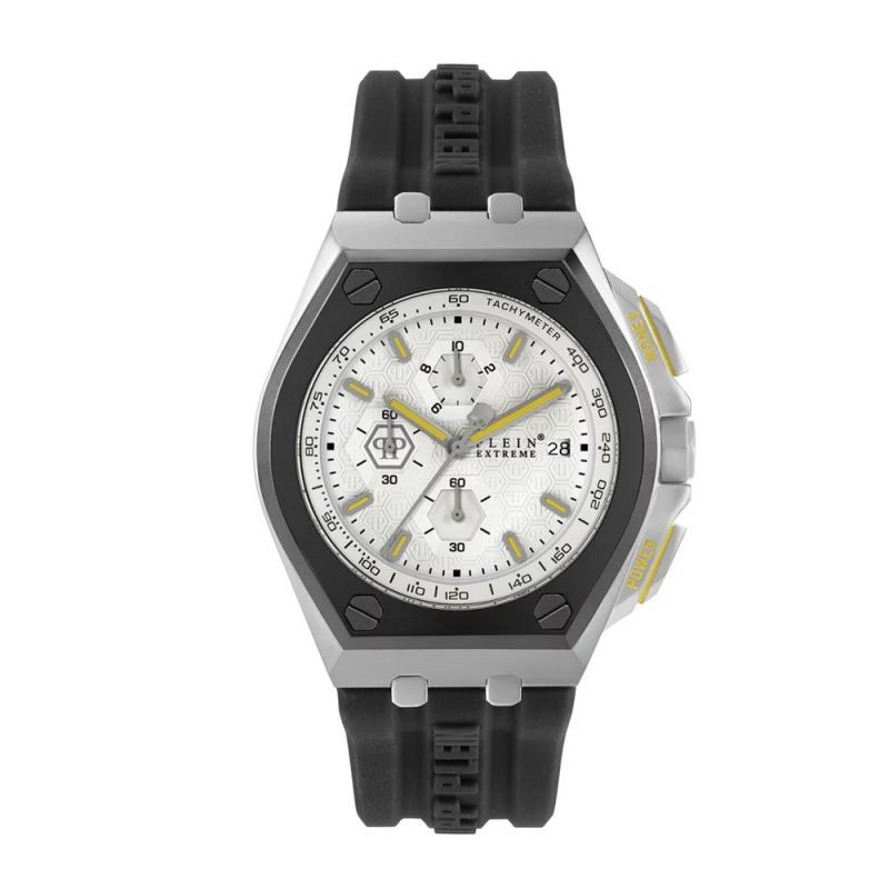 Мъжки часовник Philipp Plein със спортно-елегантен дизайн от колекция Extreme. Дисплеят е тип хронограф. Корпусът е изработен от неръждаема стомана. Каишката е силиконова в черен цвят с логото на марката. Стъклото е минерал-кристал. Часовникът се задвижва от кварцов механизъм. Водоустойчивост 5 ATM - допускат се леки пръски и взимане на душ, не се препоръчва обилно мокрене.