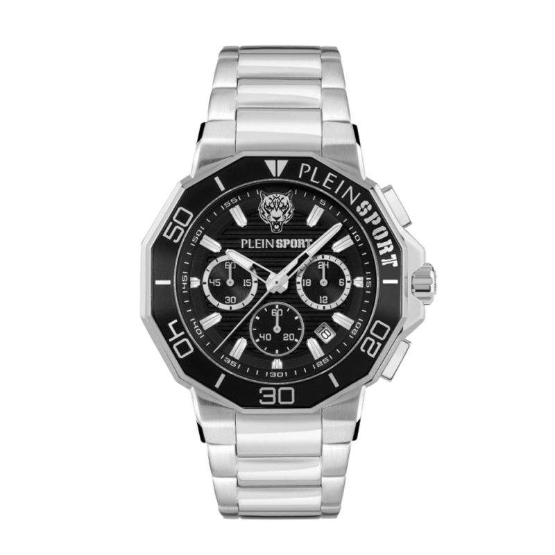 Мъжки часовник Philipp Plein със спортно-елегантен дизайн от колекция Plein Sport. Дисплеят е хронограф в черен цвят със сребристи детайли. Луминесцентно покритие върху стрелките и индексите. Корпус и верижка изработени от неръждаема стомана. Диаметър на корпуса 46 мм. Стъкло минерал-кристал. Часовникът се задвижва от кварцов механизъм. Водоустойчивост 5 ATM - допускат се леки пръски и взимане на душ, не се препоръчва обилно мокрене.