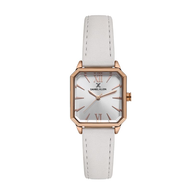 Дамски часовник Daniel Klein от колекцията Premium. Аналогов дисплей в сребрист цвят с изчистен дизайн. Метален корпус в комбинация с бяла каишка от естествена кожа. Стъкло минерал-кристал. Задвижва се от кварцов механизъм VJ21C1. Водоустойчивост 3 ATM - допускат се леки пръски, не се препоръчва обилно мокрене.