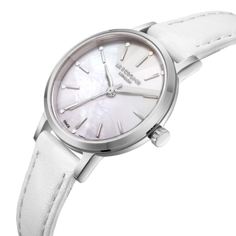 Стилен дамски часовник Lee Cooper от колекцията Elegance. Моделът е с корпус от супер метал и кожена каишка. Дисплеят е аналогов в красив седефен цвят със сребристи детайли и нежни кристали. Диаметър на корпуса 28 мм. Стъклото е минерал-кристал. Часовникът се задвижва от кварцов механизъм. Водоустойчивост 3 ATM - допускат се леки пръски, не се препоръчва обилно мокрене.