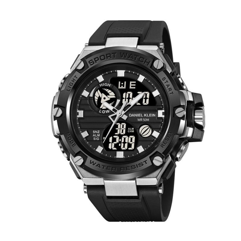 Мъжки часовник Daniel Klein със спортен дизайн от колекцията Digital. Дисплей комбинация от аналогов и дигитален. Плексигласово стъкло. Корпус изработен от полимер. Черна каишка от полимер. Часовникът има следните функции: показател за дата и ден от седмицата, 12/24 часов формат, аларма и осветяване на дисплея. Задвижва се от кварцов механизъм. Водоустойчивост 5 ATM - допускат се леки пръски и взимане на душ, не се препоръчва обилно мокрене.