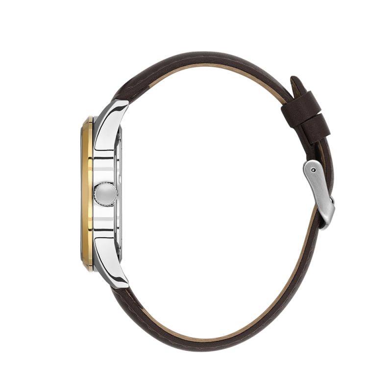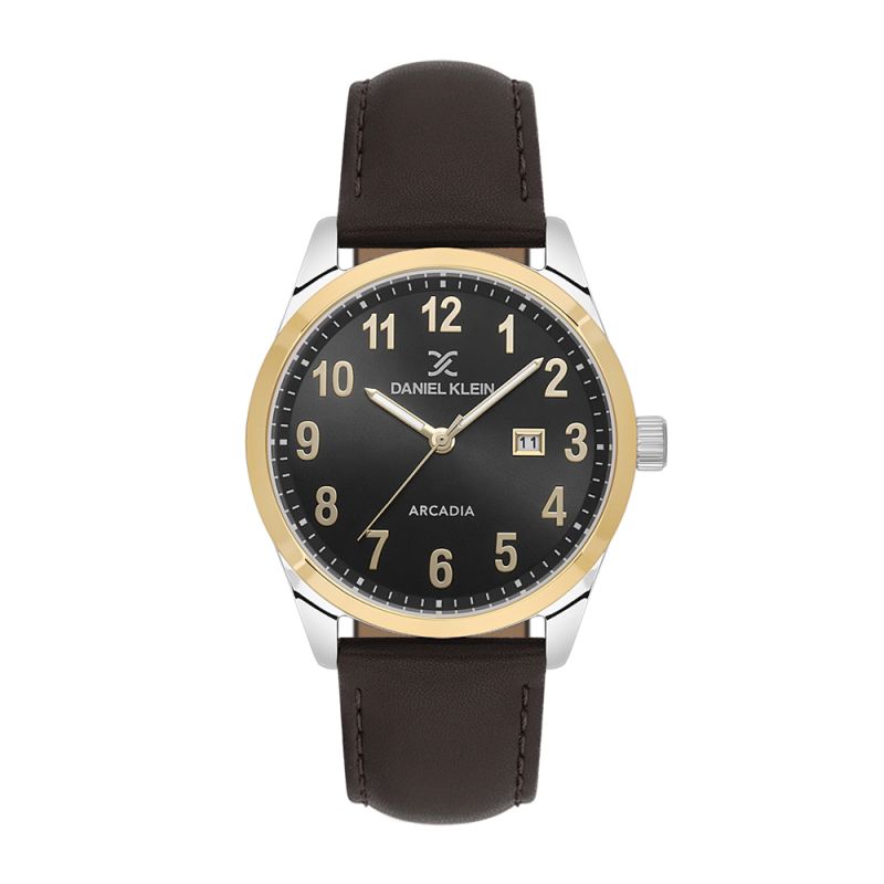 Стилен мъжки часовник Daniel Klein с метален корпус от колекцията Arcadia. Аналогов дисплей в черен цвят с показател за дата. Кафява каишка от естествена кожа. Диаметър на корпуса 49.5 мм. Стъкло минерал-кристал. Задвижва се от кварцов механизъм PC32S11. Водоустойчивост 3 ATM - допускат се леки пръски, не се препоръчва обилно мокрене.