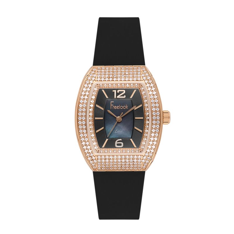 Модерен дамски часовник Freelook със спортно-елегантна визия от колекцията Charmant. Корпус изработен от неръждаема стомана. Черна силиконова каишка. Аналогов дисплей с вътрешна част от седеф. Декорация от нежни кристали по безела. Стъкло минерал-кристал. Задвижва се от кварцов механизъм с калибър VJ21C1. Водоустойчивост 5 ATM - допускат се леки пръски и взимане на душ, не се препоръчва обилно мокрене.