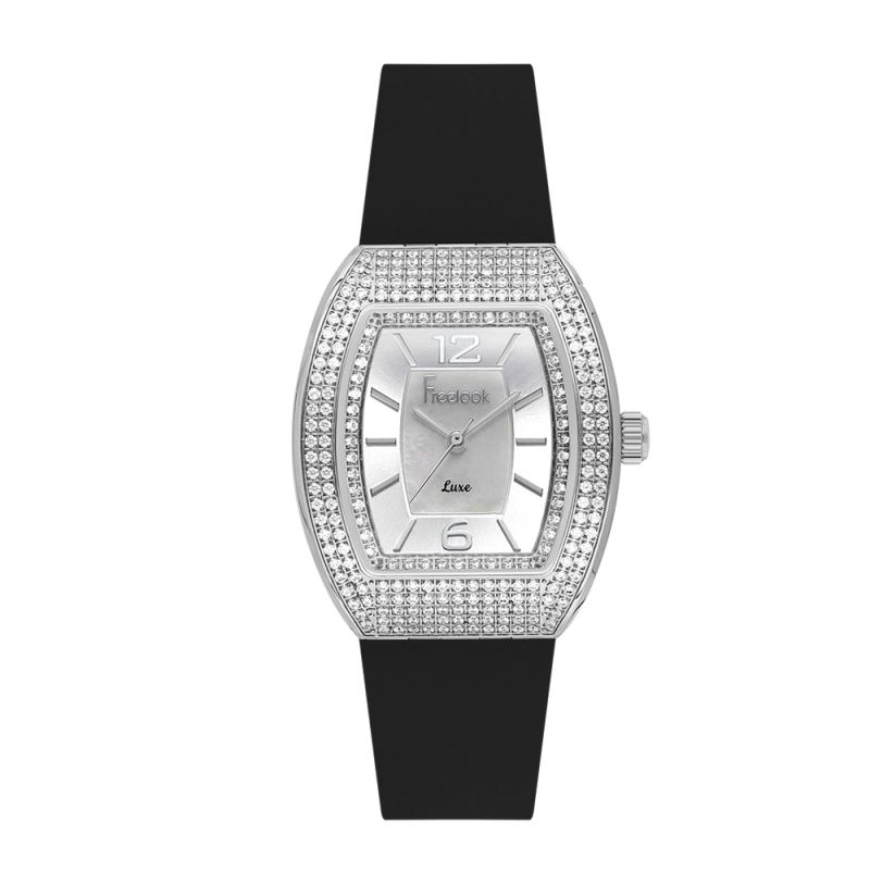 Модерен дамски часовник Freelook със спортно-елегантна визия от колекцията Charmant. Корпус изработен от неръждаема стомана. Черна силиконова каишка. Аналогов дисплей с вътрешна част от седеф. Декорация от нежни кристали по безела. Стъкло минерал-кристал. Задвижва се от кварцов механизъм с калибър VJ21C1. Водоустойчивост 5 ATM - допускат се леки пръски и взимане на душ, не се препоръчва обилно мокрене.