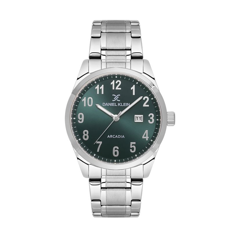 Мъжки часовник Daniel Klein със спортно-елегантна визия от колекцията Arcadia. Аналогов дисплей в тъмнозелен цвят с показател за дата. Метален корпус в комбинация с верижка от неръждаема стомана. Диаметър на корпуса 49.5 мм. Стъкло минерал-кристал. Задвижва се от кварцов механизъм PC32S11. Водоустойчивост 3 ATM - допускат се леки пръски, не се препоръчва обилно мокрене.