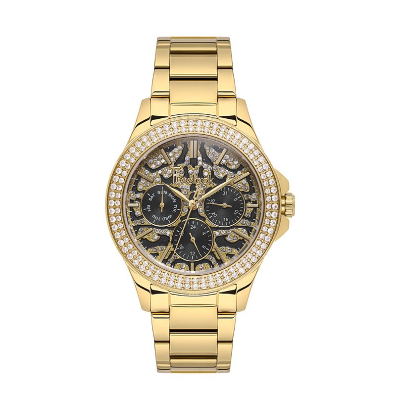 Впечатляващ дамски часовник Freelook с изящна визия от колекцията Charmant. Моделът е с декорация от кристали върху безела. Корпусът и верижката са изработени от неръждаема стомана. Дисплеят е мултифункционален с декорация от нежни кристали. Стъклото е минерал-кристал. Задвижва се от кварцов механизъм с калибър VX3JE1. Водоустойчивост 5 ATM - допускат се леки пръски и взимане на душ, не се препоръчва обилно мокрене.