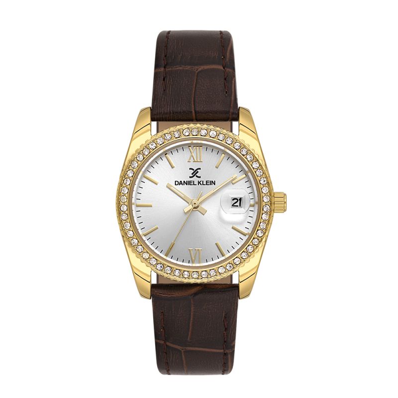 Стилен дамски часовник Daniel Klein с красив дизайн от колекцията Premium. Сребрист аналогов дисплей с показател за дата. Декорация от нежни кристали по безела. Метален корпус. Диаметър на корпуса 37.5 мм. Кафява каишка от естествена кожа. Стъкло минерал-кристал. Задвижва се от кварцов механизъм VX12E11. Водоустойчивост 3 ATM - допускат се леки пръски, не се препоръчва обилно мокрене.