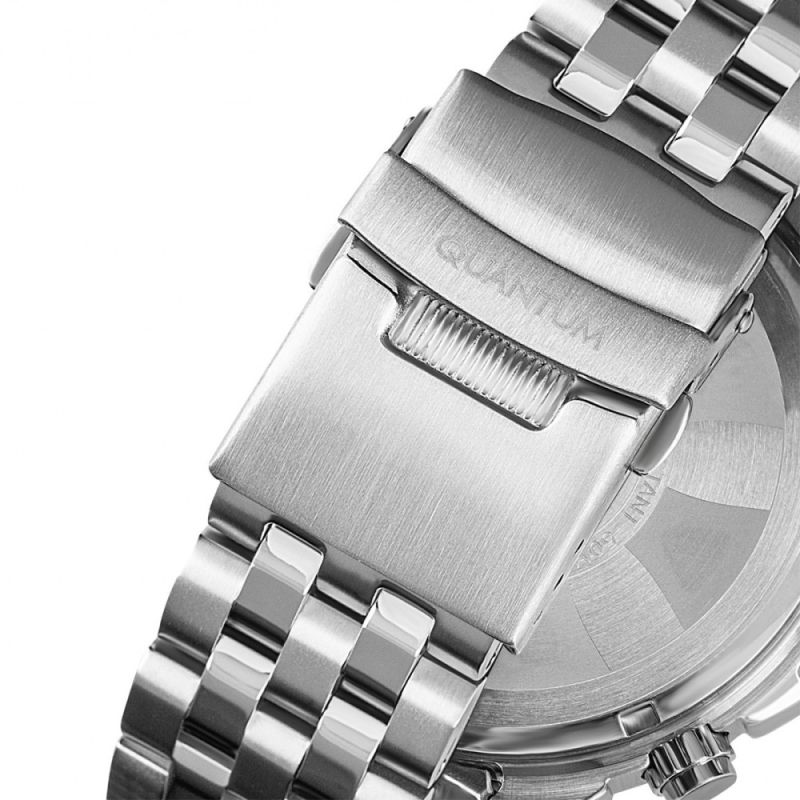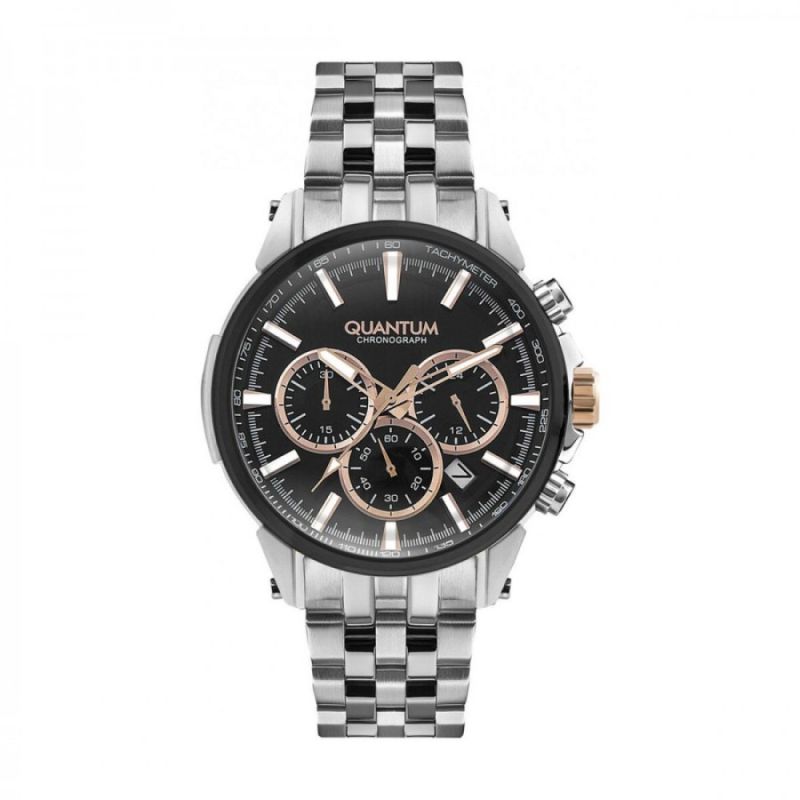 Мъжки часовник Quantum със спортно-елегантен дизайн от колекцията Powertech. Черен дисплей хронограф с луминесцентно покритие на стрелките и индексите. Стъкло минерал-кристал. Корпус и верижка от неръждаема стомана. Часовникът се задвижва от кварцов механизъм с калибър VR32A15. Водоустойчивост 10 ATM - позволява мокрене, къпане и плуване във водни басейни.