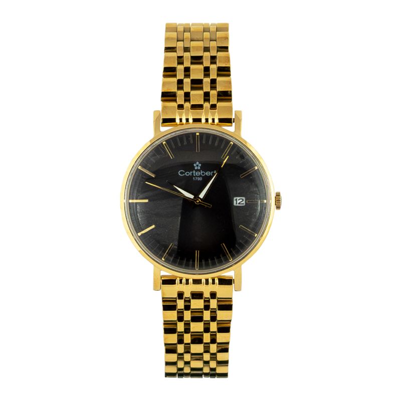 Спортно-елегантен мъжки часовник Cortebert. Моделът е с корпус и верижка от неръждаема стомана. Черен аналгов дисплей с показател за дата и златисти детайли. Стъкло минерал-кристал. Задвижва се от кварцов механизъм. Водоустойчивост 3 ATM - допускат се леки пръски, не се препоръчва обилно мокрене.