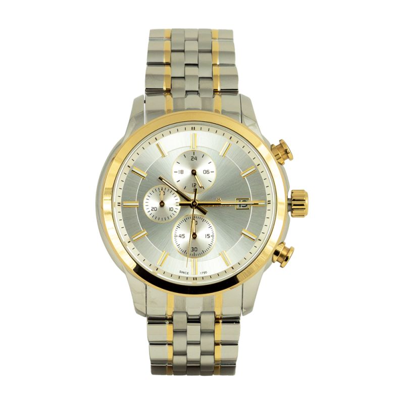 Мъжки часовник Cortebert с модерен класически дизайн. Корпусът и верижката са изработени от неръждаема стомана. Дисплеят е тип хронограф в сребрист цвят със златисти детайли. Стъклто е минерал-кристал. Диаметър на корпуса 43 мм. Задвижва се от кварцов механизъм. Водоустойчивост 3 ATM - допускат се леки пръски, не се препоръчва обилно мокрене.
