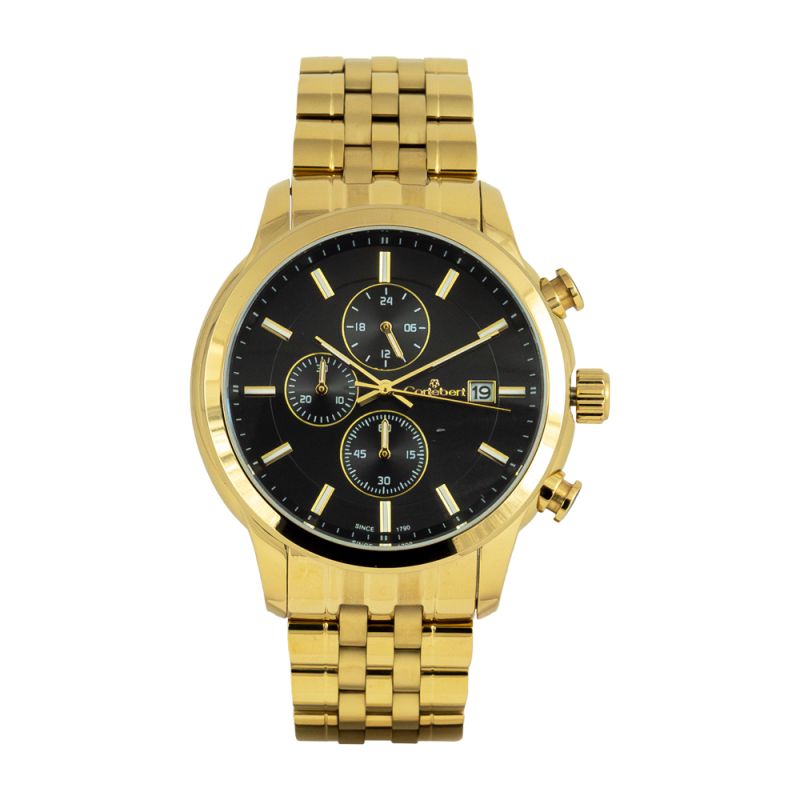 Мъжки часовник Cortebert с модерен класически дизайн. Корпусът и верижката са изработени от неръждаема стомана. Дисплеят е тип хронограф в черен цвят със златисти детайли. Стъклто е минерал-кристал. Диаметър на корпуса 43 мм. Задвижва се от кварцов механизъм. Водоустойчивост 3 ATM - допускат се леки пръски, не се препоръчва обилно мокрене.