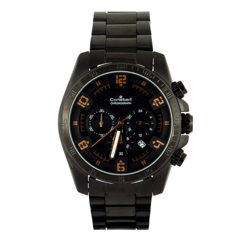 Мъжки часовник Cortebert със спортно-елегантен дизайн. Черен дисплей тип хронограф с луминисцентни стрелки. Корпус и верижка от неръждаема стомана. Стъкло минерал-кристал. Задвижва се от кварцов механизъм. Водоустойчивост 3 ATM - допускат се леки пръски, не се препоръчва обилно мокрене.