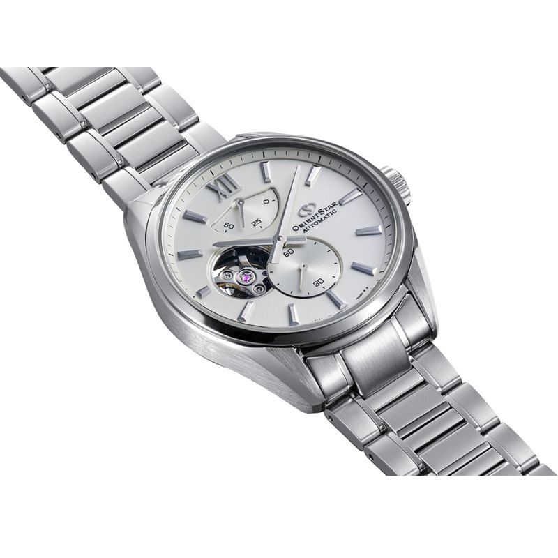 Класически модел мъжки часовник Orient Star с елегантен дизайн от колекцията M-Collection /M34 F7/ Semi Skeleton. Моделът е с аналогов дисплей с отвор, позволяващ да се наблюдава част от механизма, индикатор за резервна мощност и отделен секундарник. Корпусът и верижката са изработени от неръждаема стомана. Стъклото е сапфир-кристал със супер антирефлексно покритие. Часовникът се задвижва от автоматичен механизъм F7F44 с 24 камъка и 50 часа резервна мощност. Диаметър на корпуса 40 мм. Водоустойчивост 10 ATM - позволява мокрене, къпане и плуване във водни басейни.