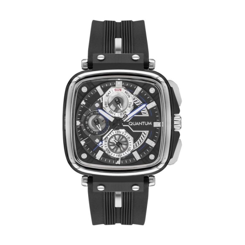 Мъжки часовник Quantum със спортно-ежедневен дизайн от колекцията Powertech. Мултифункционален дисплей с луминесцентно покритие на стрелките и индексите. Стъкло минерал-кристал с антирефлексно покритие. Корпус от неръждаема стомана. Черна силиконова каишка. Задвижва се от кварцов механизъм с калибър VX9NE. Водоустойчивост 10 ATM - позволява мокрене, къпане и плуване във водни басейни.