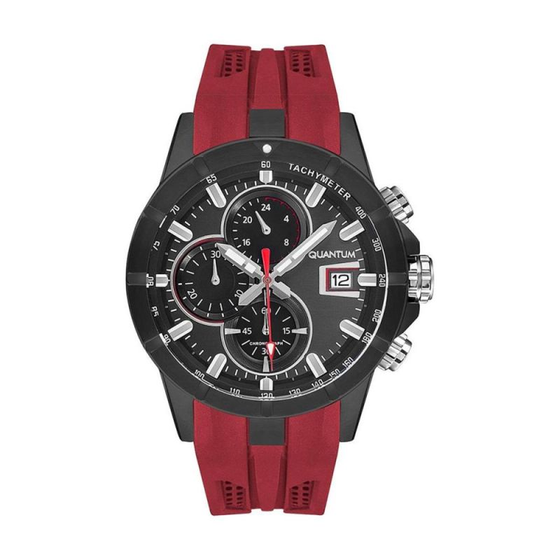 Мъжки часовник Quantum със спортен дизайн. Дисплей тип хронограф. Стъкло минерал-кристал. Корпус от неръждаема стомана. Тъмночервена силиконова каишка. Диаметър на корпуса 47 мм. Задвижва се от кварцов механизъм с калибър VR33B21. Водоустойчивост 10 ATM - позволява мокрене, къпане и плуване във водни басейни.