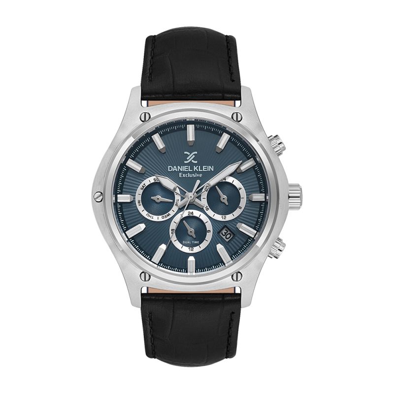 Стилен мъжки часовник Daniel Klein от колекцията Exclusive .Мултифункционален дисплей в тъмносин цвят със сребристи детайли. Метален корпус. Диаметър на корпуса 49.5 мм. Черна каишка от естествена кожа. Стъкло минерал-кристал. Задвижва се от кварцов механизъм JP25-4.5. Водоустойчивост 5 ATM - допускат се леки пръски и взимане на душ, не се препоръчва обилно мокрене.