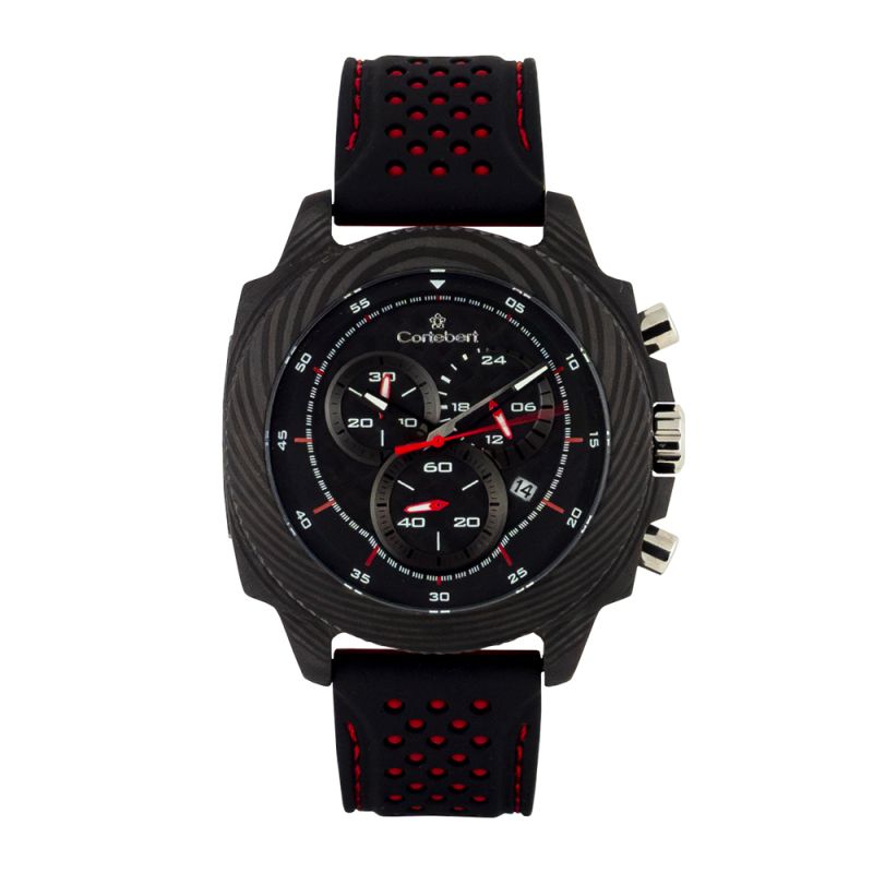 Мъжки часовник Cortebert със спортно-ежедневен дизайн. Моделът е с черен дисплей тип хронограф. Корпус от карбон, съчетан със силиконова каишка. Стъкло минерал-кристал. Задвижва се от кварцов механизъм. Водоустойчивост 3 ATM - допускат се леки пръски, не се препоръчва обилно мокрене.