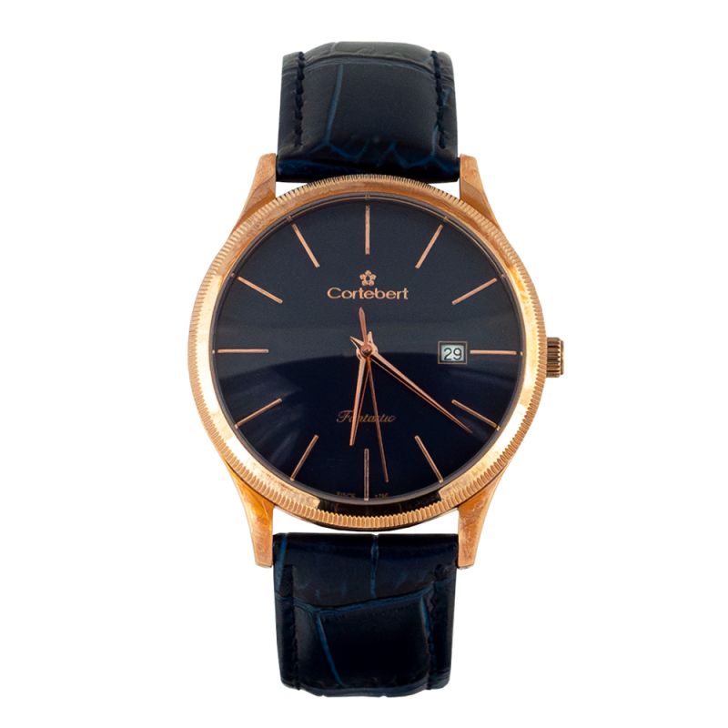 Мъжки часовник Cortebert със спортно-елегантен дизайн. Моделът е с корпус от неръждаема стомана, съчетан с каишка от естествена кожа. Тъмносин аналогов дисплей с показател за дата, стрелки и индекси в цвят розово злато. Стъкло минерал-кристал. Задвижва се от кварцов механизъм. Водоустойчивост 3 ATM - допускат се леки пръски, не се препоръчва обилно мокрене.