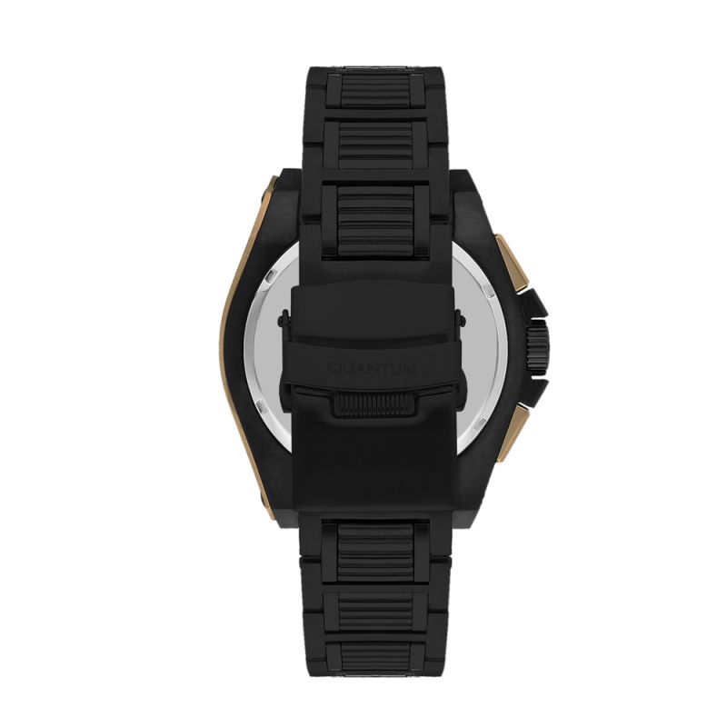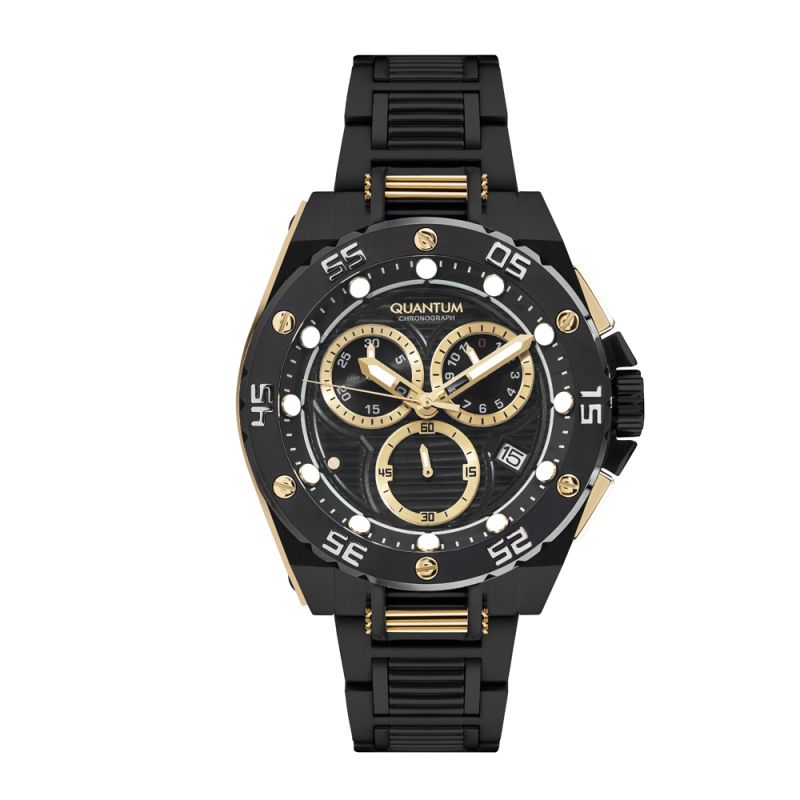 Спортно-елегантен мъжки часовник Quantum. Дисплей тип хронограф в черен цвят със златисти детайли. Стъкло минерал-кристал с антирефлексно покритие. Корпус и верижка от неръждаема стомана. Диаметър на корпуса 48 мм. Задвижва се от кварцов механизъм. Водоустойчивост 10 ATM - позволява мокрене, къпане и плуване във водни басейни.