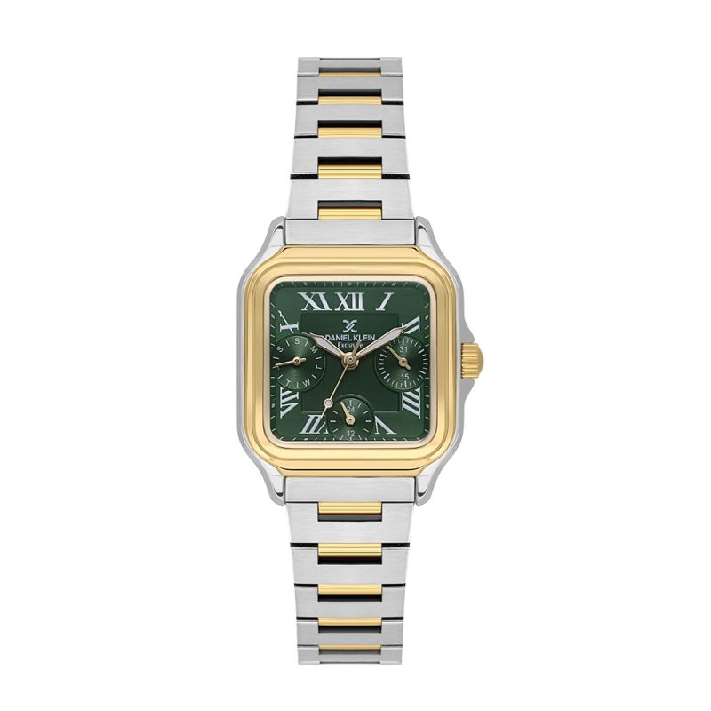 Дамски часовник Daniel Klein от колекцията Exclusive. Мултифункционален дисплей с показатели за дата, ден от седмицата и 24 часов формат. Метален корпус в комбинация с верижка от неръждаема стомана. Стъкло минерал-кристал. Задвижва се от кварцов механизъм VX3JE1. Водоустойчивост 3 ATM - допускат се леки пръски, не се препоръчва обилно мокрене.