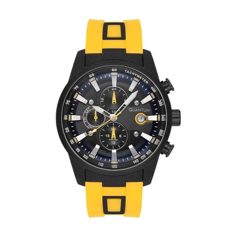 Мъжки часовник Quantum със спортен дизайн от колекцията Adrenaline. Черен мултифункционален дисплей с детайли в сребрист и жълт цвят. Луминесцентно покритие върху стрелките. Стъкло минерал-кристал. Корпус изработен от неръждаема стомана. Жълта силиконова каишка с черни акценти. Диаметър на корпуса 47 мм. Задвижва се от кварцов механизъм. Водоустойчивост 10 ATM - позволява мокрене, къпане и плуване във водни басейни.