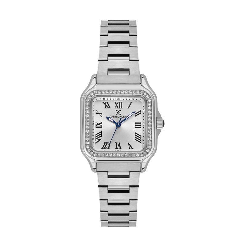 Дамски часовник Daniel Klein с елегантен дизайн от колекцията Premium. Моделът е с декорация от инкрустирани кристали по безела. Сребрист аналогов дисплей. Метален корпус в комбинация с верижка от неръждаема стомана. Стъкло минерал-кристал. Задвижва се от кварцов механизъм 2035. Водоустойчивост 3 ATM - допускат се леки пръски, не се препоръчва обилно мокрене.