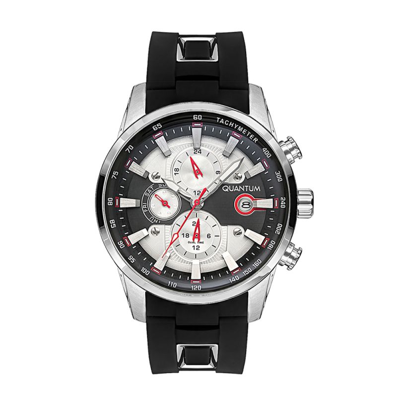 Мъжки часовник Quantum със спортен дизайн от колекцията Adrenaline. Мултифункционален дисплей с луминесцентно покритие върху стрелките и индексите. Стъкло минерал-кристал с антирефлексно покритие. Корпус изработен от неръждаема стомана. Черна силиконова каишка. Задвижва се от кварцов механизъм. Водоустойчивост 10 ATM - позволява мокрене, къпане и плуване във водни басейни.