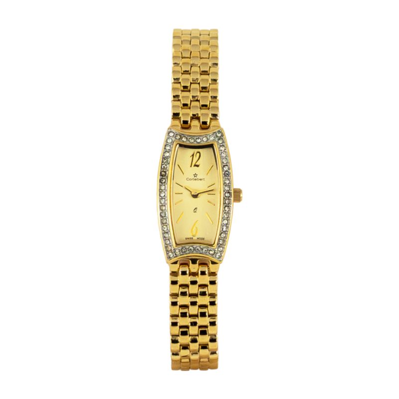 Стилен дамски часовник Cortebert с красива декорация от нежни цирконии по безела. Дисплеят е аналогов в златист цвят. Корпусът и верижката са изработени от неръждаема стомана. Стъклото е минерал-кристал. Часовникът се задвижва от кварцов механизъм. Водоустойчивост 3 ATM - допускат се леки пръски, не се препоръчва обилно мокрене.