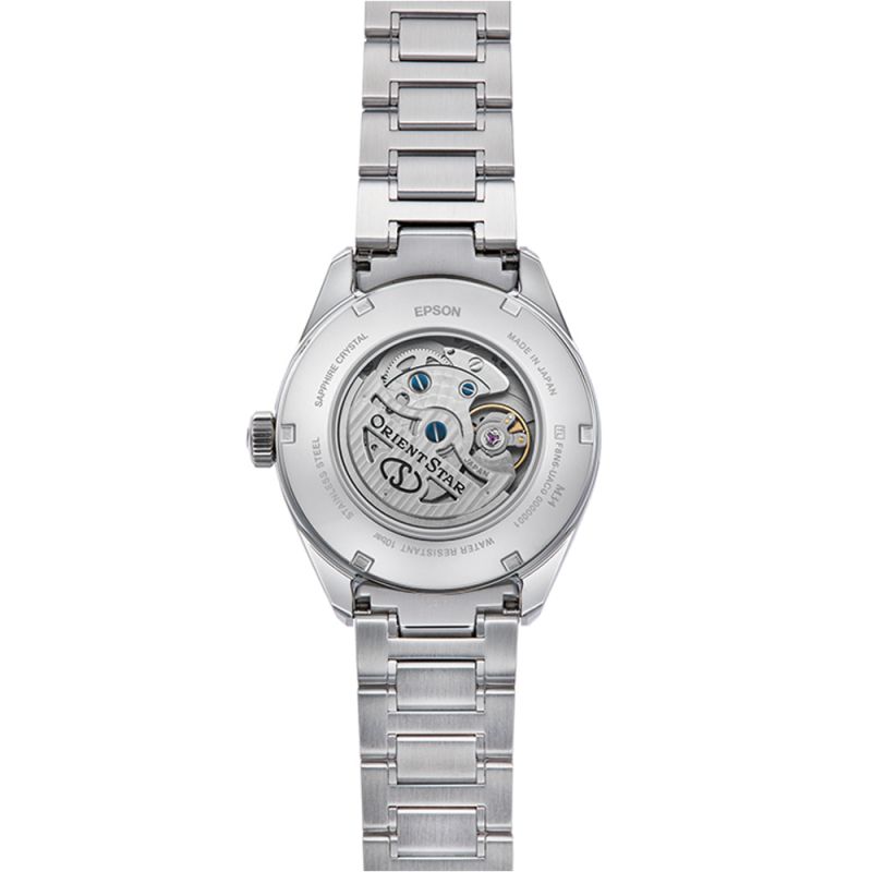 Мъжки часовник Orient Star от колекцията M-Collection /M34 F8/ Date. Моделът е с корпус и верижка от неръждаема стомана. Дисплеят е аналогов с индикатор за резервната мощност и показател за дата. Стъклото е сапфир-кристал с антрирефлексно покритие. Задвижва се от автоматичен механизъм F8N64 с резервна мощност 60 часа. През прозрачния гръб на корпуса може да се наблюдава механизма на часовника. Водоустойчивост 10 ATM - позволява мокрене, къпане и плуване във водни басейни.