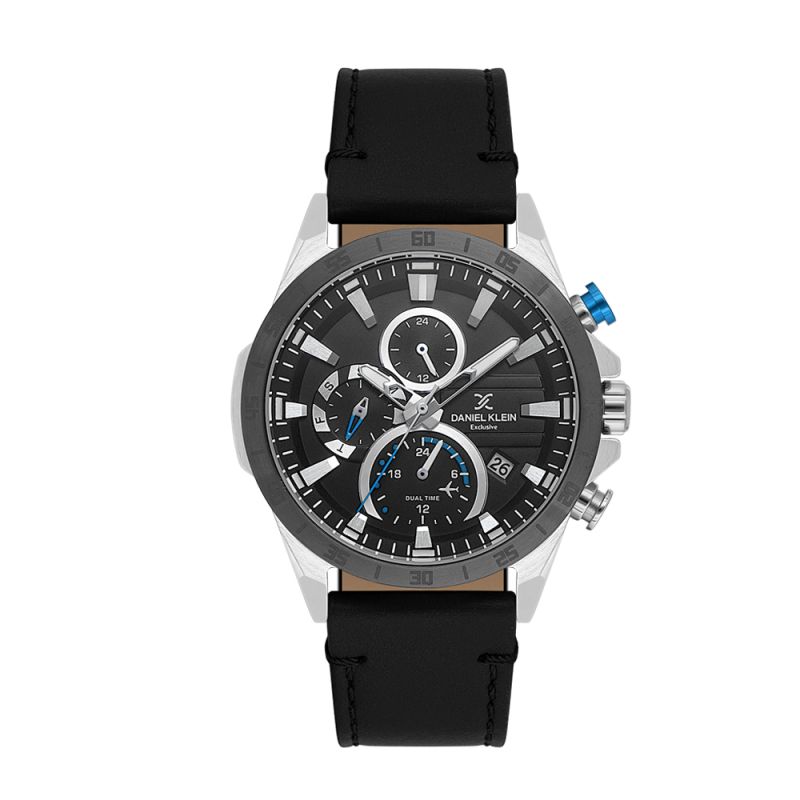 Стилен мъжки часовник Daniel Klein от колекцията Exclusive. Черна каишка от естствена кожа. Корпус изработен от метал. Диаметър на корпуса 42 мм. Мултифункционален дисплей с показатели за дата, ден от седмицата и двойно време. Стъкло минерал-кристал. Часовникът се задвижва от кварцов механизъм JP15-3. Водоустойчивост 5 ATM - допускат се леки пръски и взимане на душ, не се препоръчва обилно мокрене.